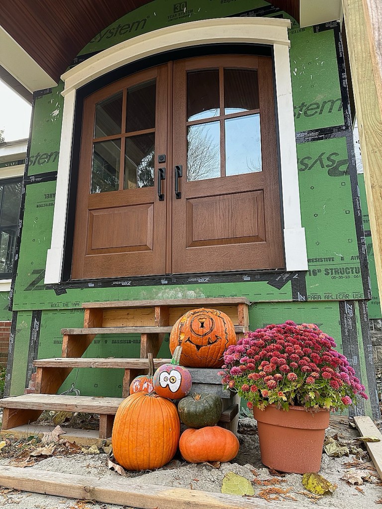 When we got home, we decorated our front doors (eek! No steps yet…) with our new pumpkins. (The tiny ones with stickers and the carved pumpkin were from a church harvest event the weekend before.)