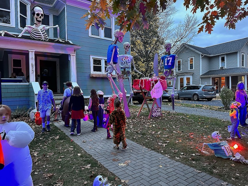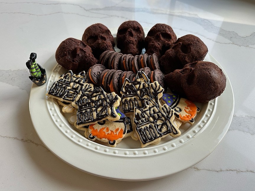 Before we knew it, Halloween was upon us! As usual, we planned to join the Nyes at their house for a quick dinner and trick-or-treating. I delivered a tray of goodies earlier in the day, so that we could trick-or-treat our way over more easily. Andrew found a skull-shaped baking pan and surprised Maelle and me with it!