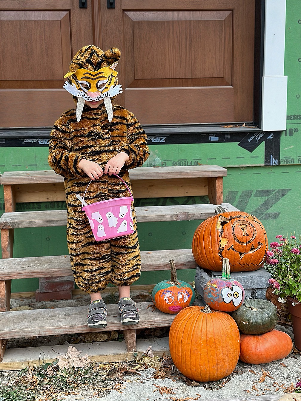 Initially, I was THRILLED she wanted to be a tiger, as it’s an easy costume for keeping your kid warm. Here in WNY, almost all our Halloweens are cold and wet, which means layers and coats over costumes. Unfortunately, we had a VERY unseasonable heat wave this year, and everyone was sweating to death in their costumes! I think it was in the 80s, and poor Maelle could barely wear the tiger costume with just a t-shirt and shorts underneath!