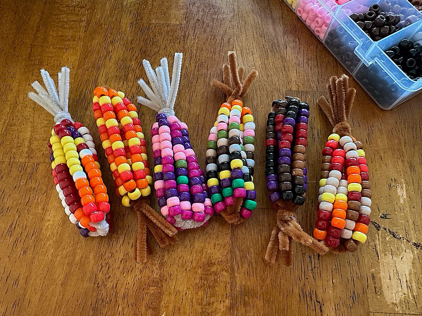 Maelle and I used her bead kit and some pipe cleaners to make these adorable little Indian corns. We used them on the table as decoration for the big meal.