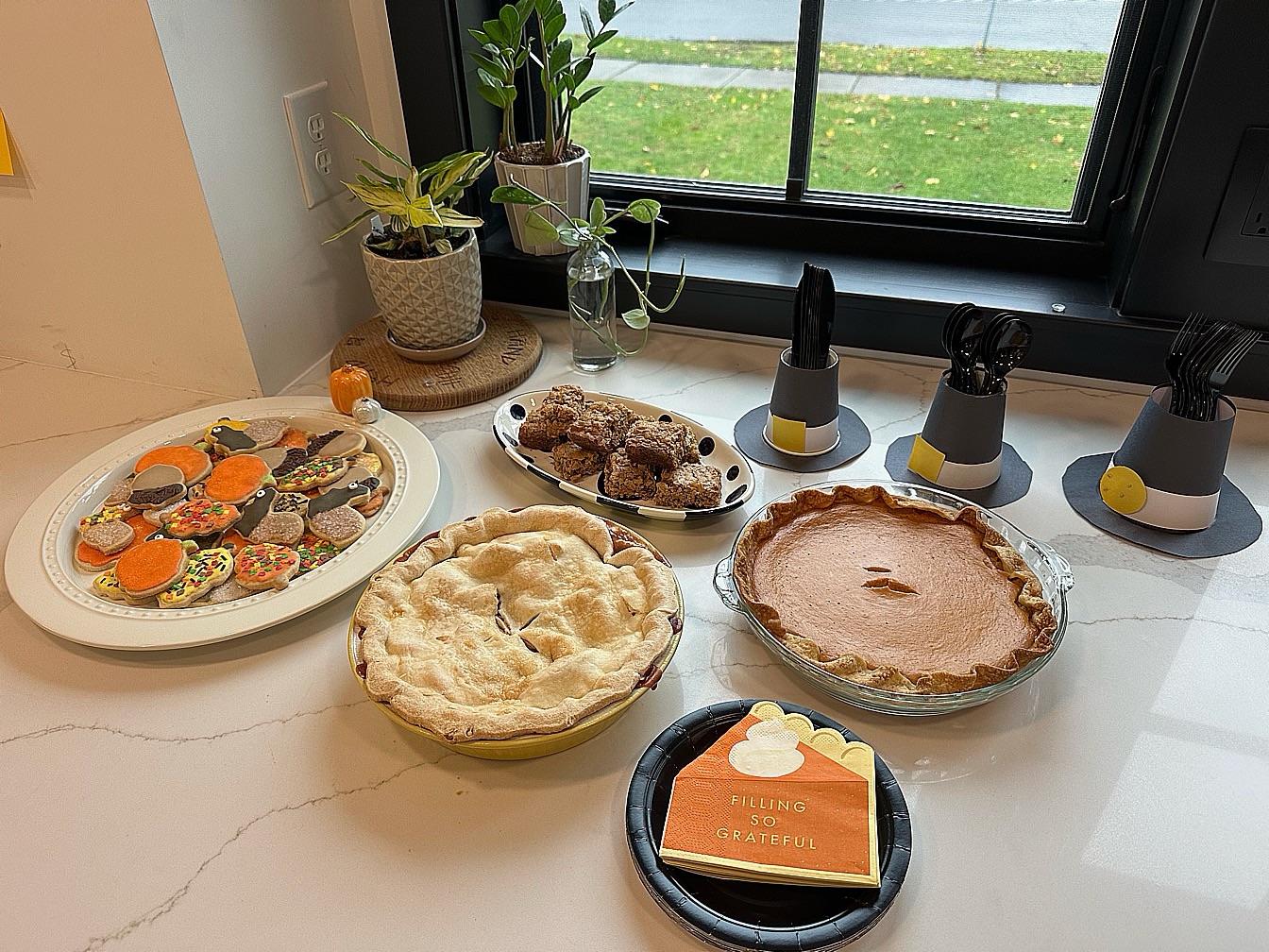 For dessert, we had decorated cookies, apple pie and pumpkin pie. Maelle helped me make the little pilgrim hats for our utensils.