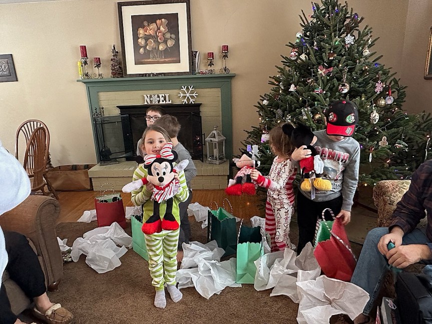 After all the presents had been opened, we had one final surprise for all the kids. We had them line up, and they each received a gift bag, which they opened at the same time. Each child received a Minnie or Mickey Mouse stuffed animal…and then we told them we were going to Walt Disney World! Maelle was so excited–she immediately said, “I know what that is!” The trip will be in February!