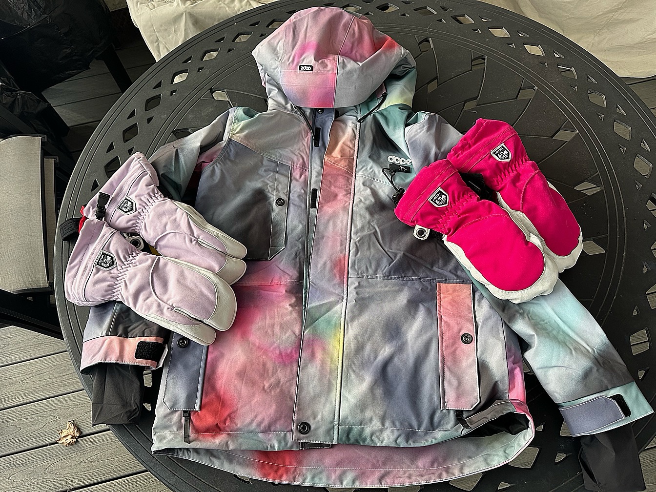 Remember that dilemma I had with my new ski jacket? Well, I’d asked my MIL for new ski gloves for Christmas, and chose the lavender color to coordinate with the jacket. However, after seeing them together, I felt like the Raspberry color (which had been the color I liked initially) would look better. (Below is a photo of my new gloves and ski jacket, with a friend’s mittens in Raspberry. The Raspberry really pops, while the Lavender just looks washed out, IMO.). So, after much discussion and debate, I was able to exchange them for the pink ones.