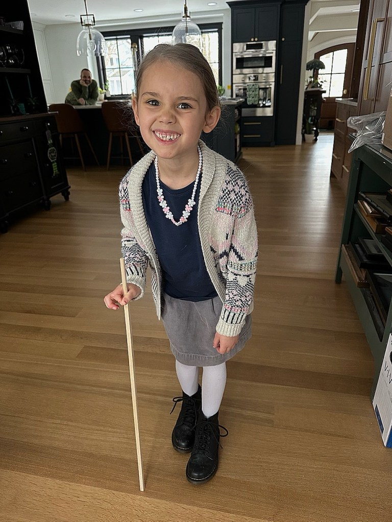 Interestingly enough, her outfit isn’t that far off from her normal; she LOVES this sweater! We added a necklace and tights, and I added some dry shampoo to her hair to make it look gray.