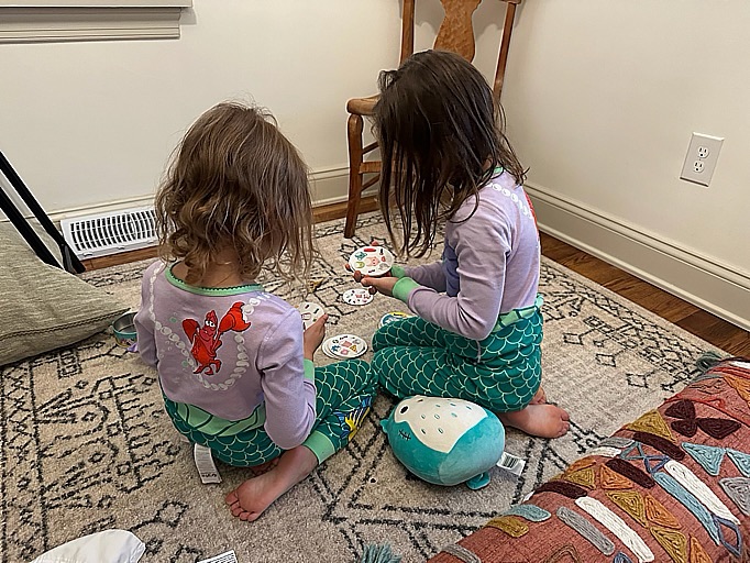 We stayed together at an Airbnb just outside of State College, and we arrived on Friday night in time to do a pizza dinner at the house. We also celebrated both Johnson kiddos’ birthdays, since Nora’s is in March and Hampton’s would be coming up in early May. We gave Nora this Squishmallow Spot It! game (one of Maelle’s favorites) and the girls played it all weekend. We also surprised them with matching Ariel jams, which Abigail and I bought after our trip to Disney in February.