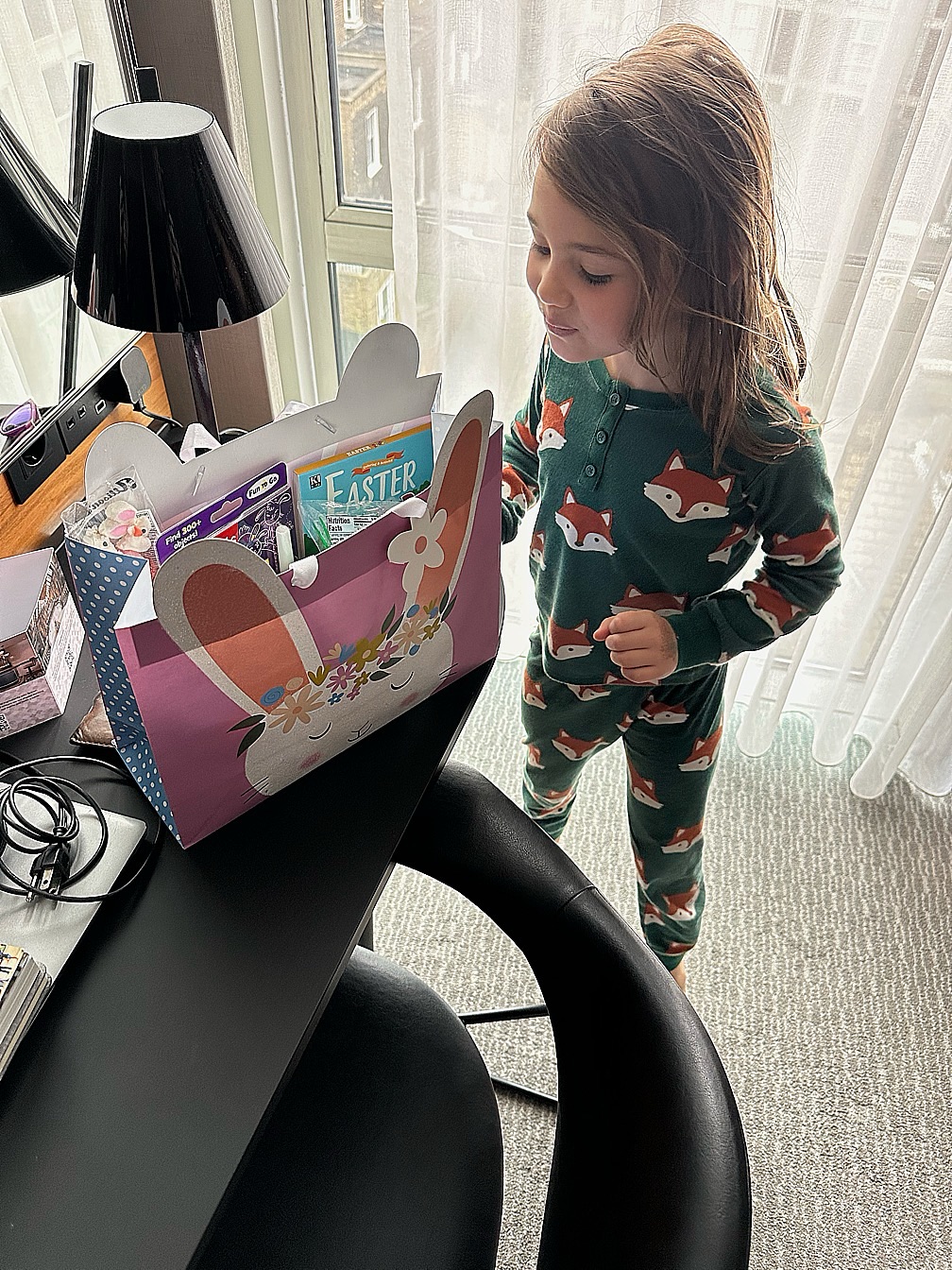 The next day was Easter, and I’d packed a simple ‘Easter basket’ using a gift bag and filled it with practical activities and squish-able items for our trip, like activity pads and a mini-Squish mallow.
