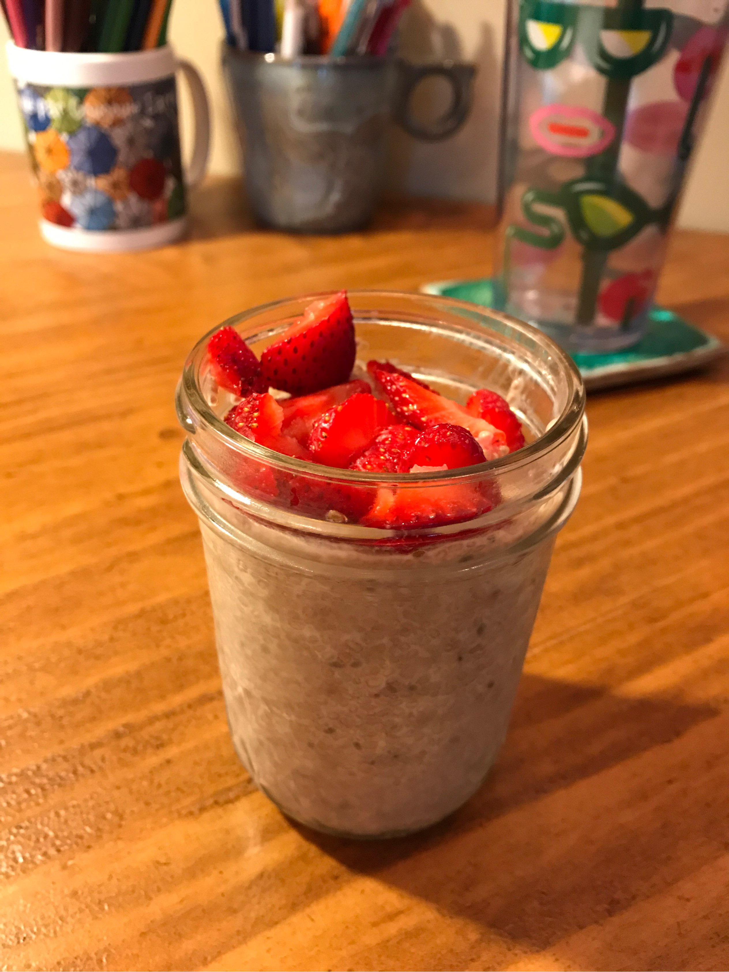 I typically buy unsweetened vanilla almond/cashew milk, in which case I add 1 T of maple syrup to 6 ounces milk. Recently, the co-op was out of the unsweetened variety, so I bought the original version (which has sugar) and omitted the maple syrup. While the bag of chia seeds claims you only need 2 T of seeds to 6 ounces water, I found it didn’t gel enough. I increased it to 3 T seeds to 6 ounces liquid and it turned out perfectly. (I also found other sources online who use the 3:6 ratio.)
