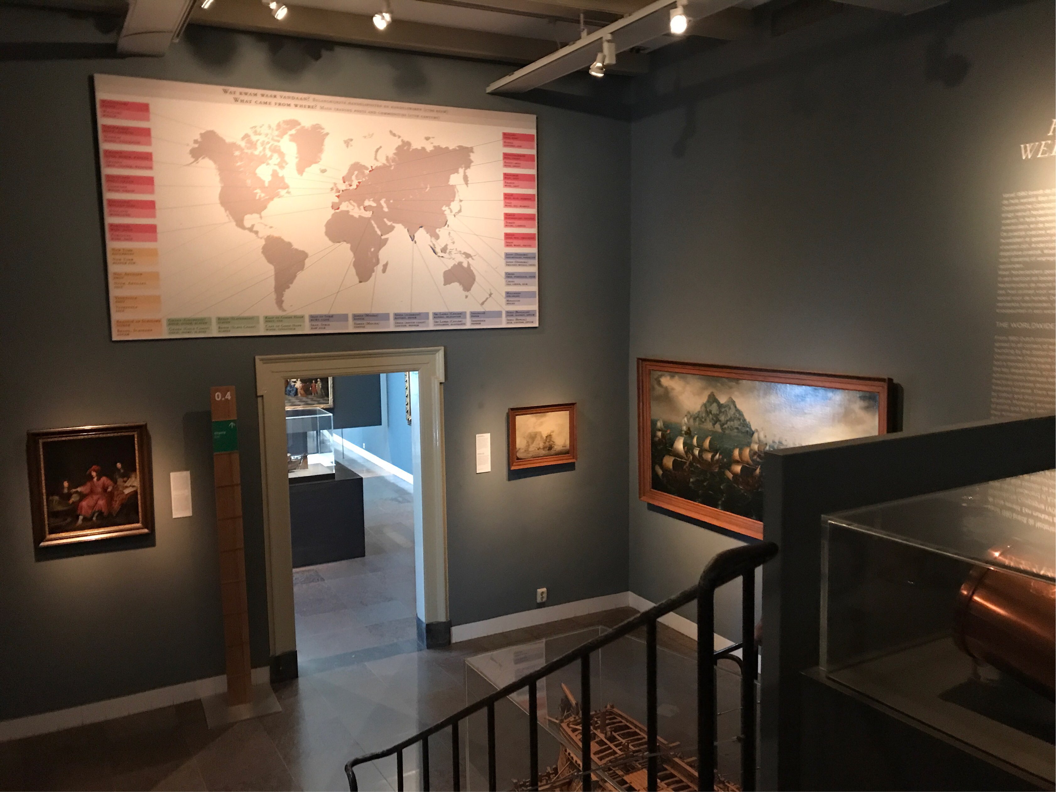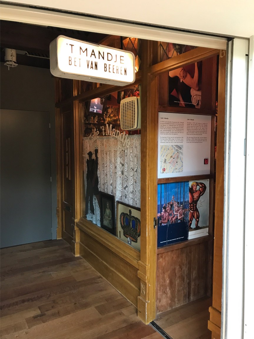 Continuing along the walk, we came to the Amsterdam Museum, which presented the history and current statistics of the city in a fun way using their ‘DNA exhibit.’ The museum includes interactive spaces (see Andrew, below, on a bicycle; as he pedals, the video progresses in time to modern day), models (see the Royal Palace, below next), artwork and even an almost-full-size replica of the first gay bar in the city (last photo).