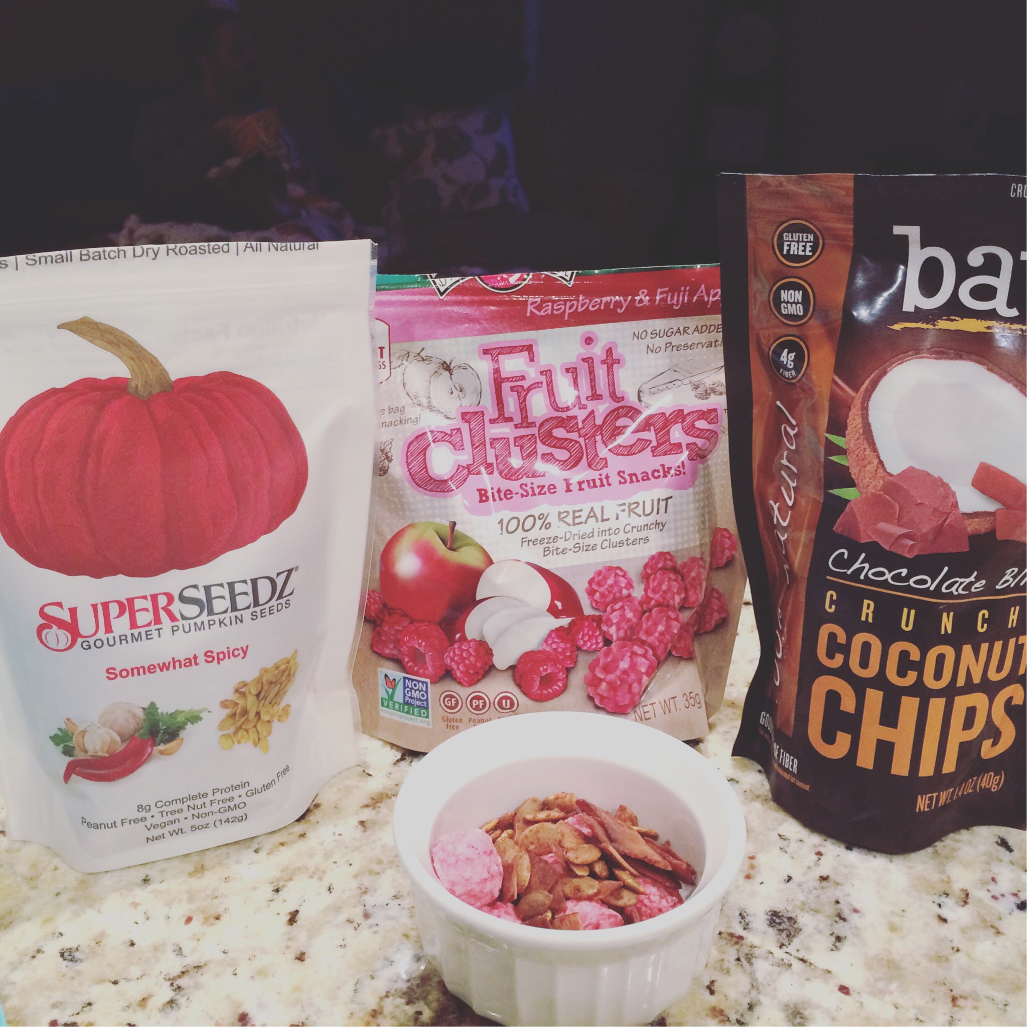 Later that night, Andrew and I decided to grab a Redbox movie and some snacks. He’s totally abandoned the Whole30, but I stuck to my guns and was pleasantly surprised at what kind of ‘compliant’ snack items I could find. I’ve been dying to have an excuse to spend $5 on a bag of seasoned pumpkin seeds to top salads, so I chose the spicy version, which didn’t have added sugar. The freeze-dried fruit clusters seemed almost too ‘candy-like’ to me, so I only had a couple. I was also able to find roasted coconut flakes dusted with cocoa! No added sugar or oils!