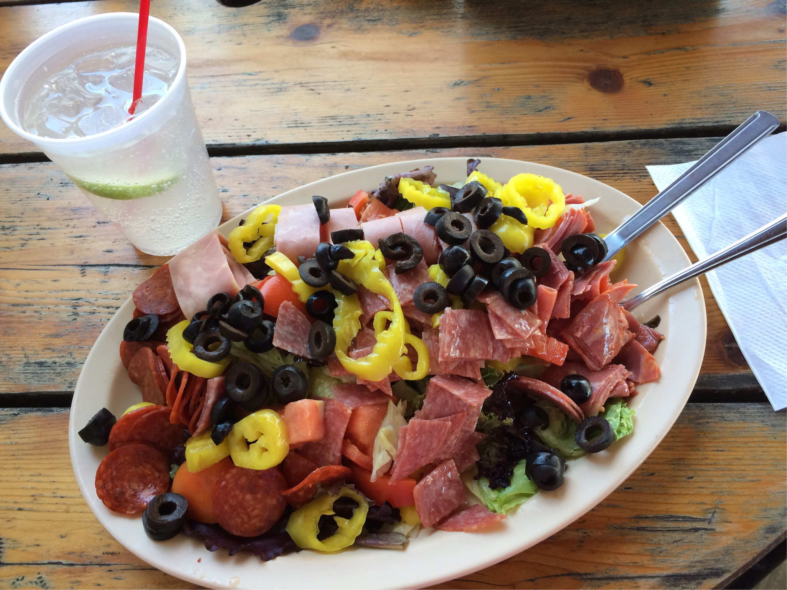 Sunday lunch: Andrew and I wanted to enjoy the weather outside, so we hit one of the only places in town with (open) outdoor eating: Wallenwein’s Hotel. I chose an antipasti salad (without cheese) and was able to make the leftovers into two lunches! Seltzer and lime to drink.