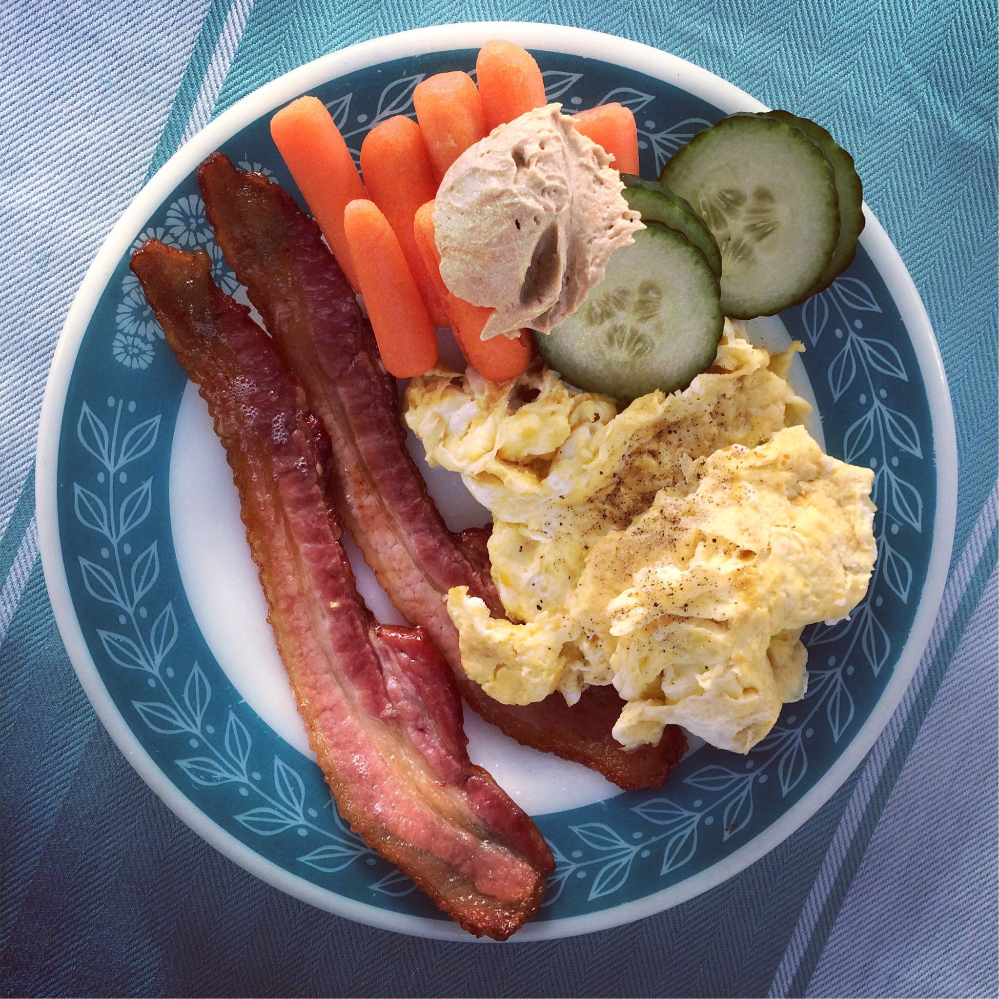 Sunday morning: bacon (!!!), eggs, veggies and Sunshine Sauce to dip!