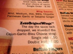 I saw the “ZebbOriginalWings” and immediately wanted them, but the bleu cheese turned Andrew off, of course. Awesome Colin said we could split an order and I eagerly anticipated their arrival.