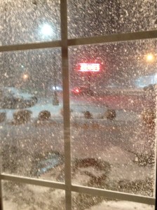 When we entered, there wasn’t really any snow on the ground. By the time we left, it was blizzarding enough for us to have to drive slowly and there was about an inch or so on the ground. It may sound odd, but I love that about living here–I love that you can go see a movie and come out to a completely different scene than when you entered. (This, I’m sure, will get old after awhile. But for now, it makes me smile.)