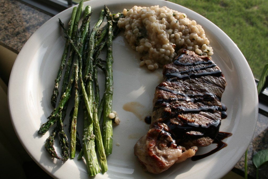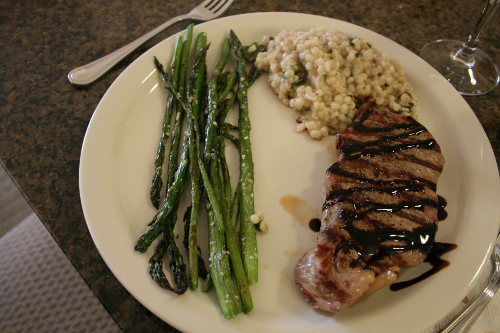 I roasted farmer’s market asparagus in the toaster oven (something I did at home a ton), made barley and added my own frozen herbs from last years’ garden and grilled steak on my grill pan. I see the grill pan getting A LOT of use this summer in the kitchenette. I drizzled my all-in-Italian balsamic syrup over the steaks. Served them up with the last of the Fingerlakes Riesling our friends JD and Sara gave us a bit ago. Again, not bad for a kitchenette.