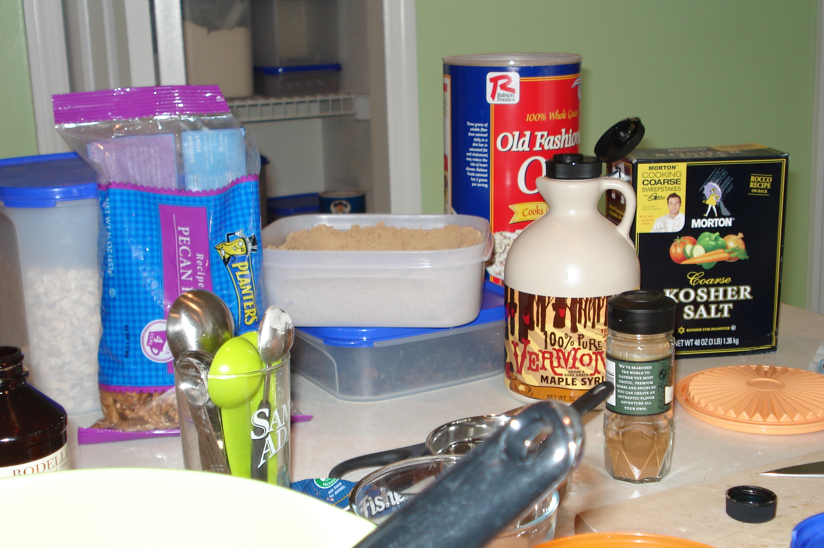 1. Preheat oven to 350 degrees. In a large bowl, combine oats, spices, salt, pecans and pepitas. Mix well.