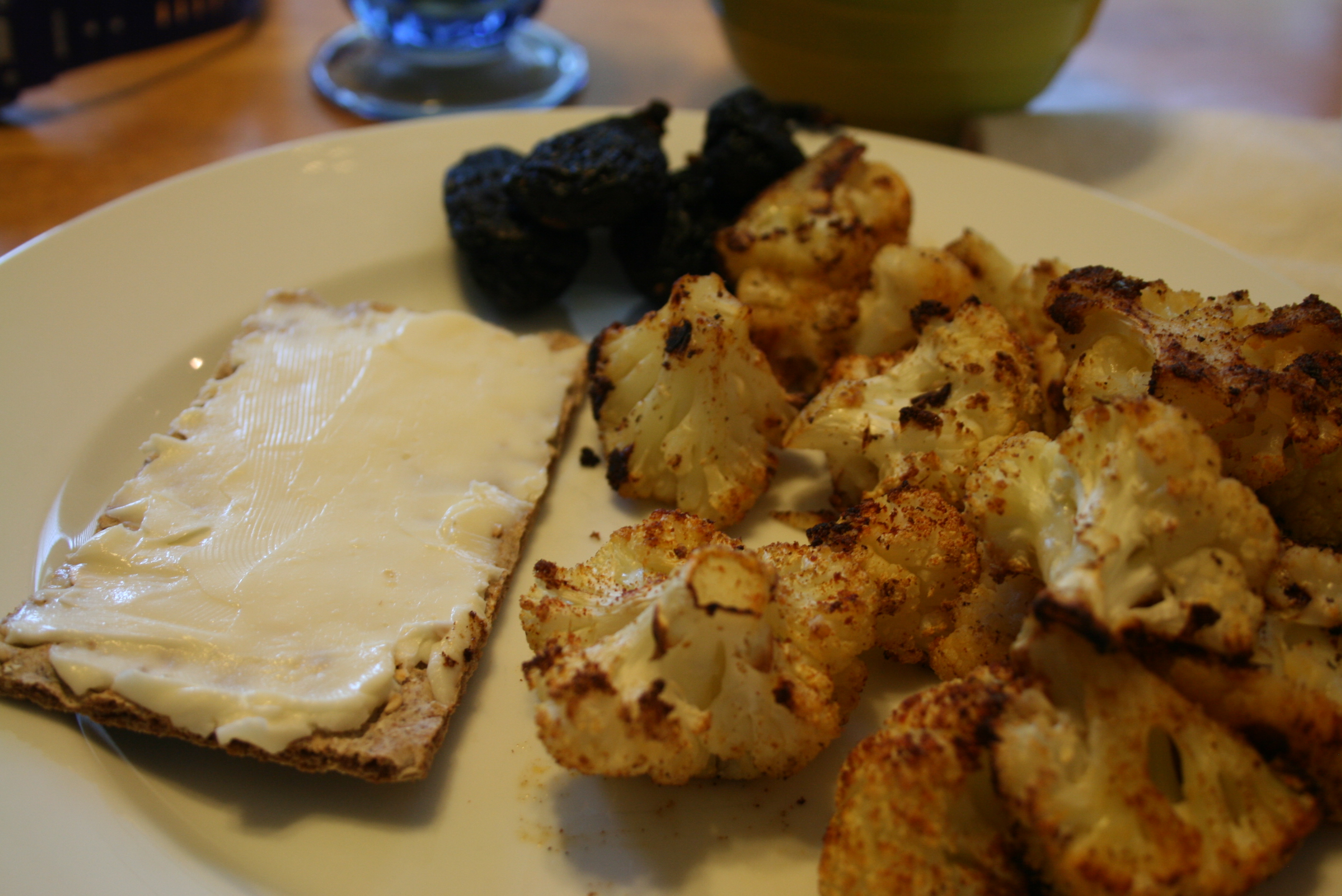 Roasted cauliflower (olive oil, cumin and paprika), a Wasa Fiber cracker spread with a Laughing Cow cheese wedge and four dried figs. Yum. I spooned up a mixture of mango and watermelon as well, but I may save that for dessert–I got full!