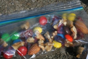 I forgot my Honey Stingers at the hotel, so I had to scavenge for portable, energy-packed foods to take with me. Thankfully, I found some nuts and dried cranberries in the kitchen–SCORE! Go Mom Layer for having 100-calorie packs of walnuts and almonds! I threw in some M&Ms to make it like trail mix, but I didn’t end up eating any. In fact, for some reason, I didn’t need more than a couple bits of nuts–must have been that sugar overload. I carried a partially full bottle of water, too. I hate carrying stuff with me, but I hate being thirsty even more.