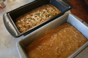 I used my mom’s interchangeable pumpkin/zucchini bread recipe. Except that I changed it around a made it healthier. It wasn’t my intention; I didn’t have butter, so I used both oil and canned apple butter (like applesauce), decreased the sugar (who needs extra sugar, anyway?) and mixed white with whole wheat flour.