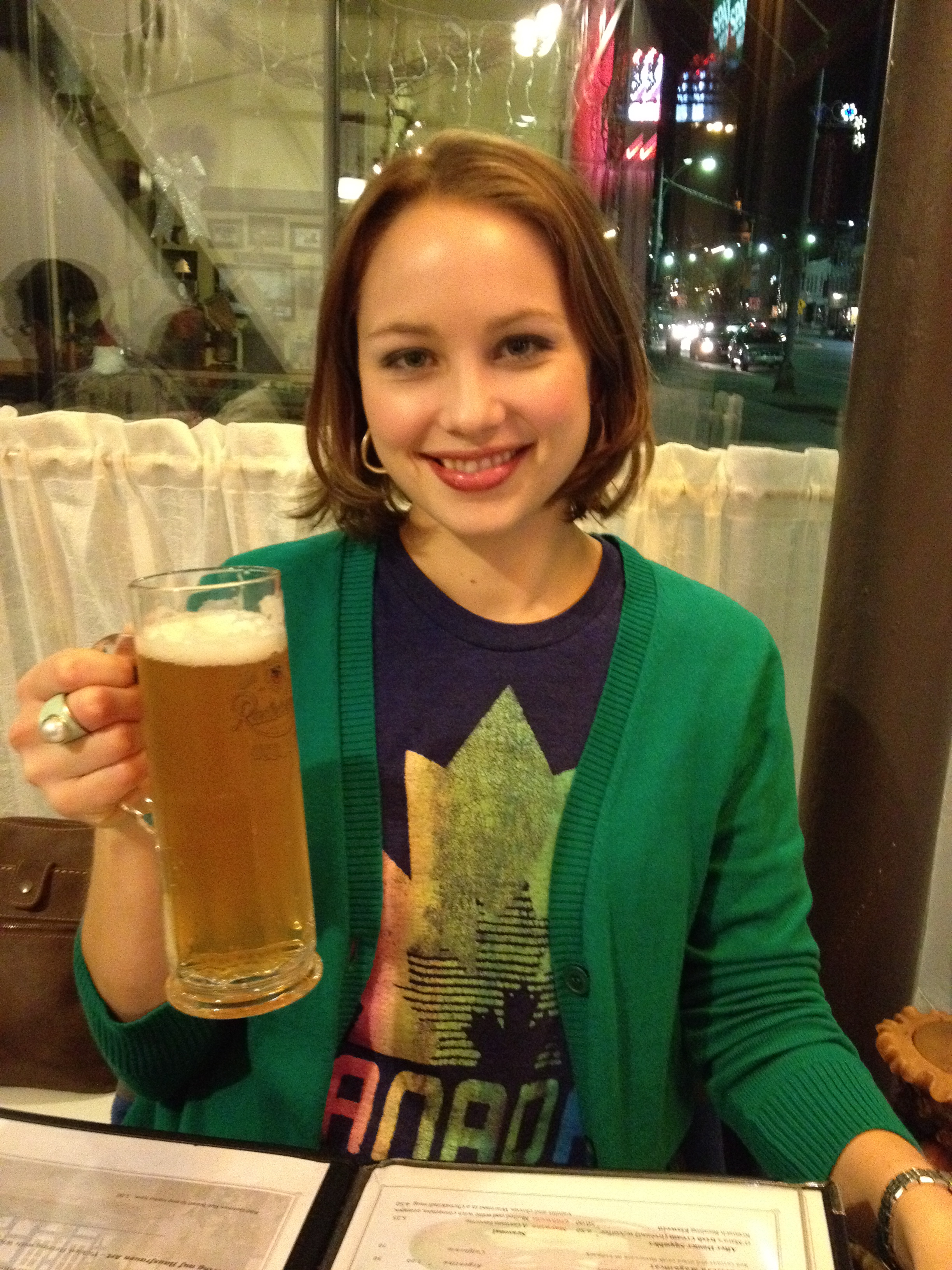 We started with a beer for him and a Jager for me, which was half beer and half hard cider. AWESOME. Don’t I look weird when I have dark lipstick on??