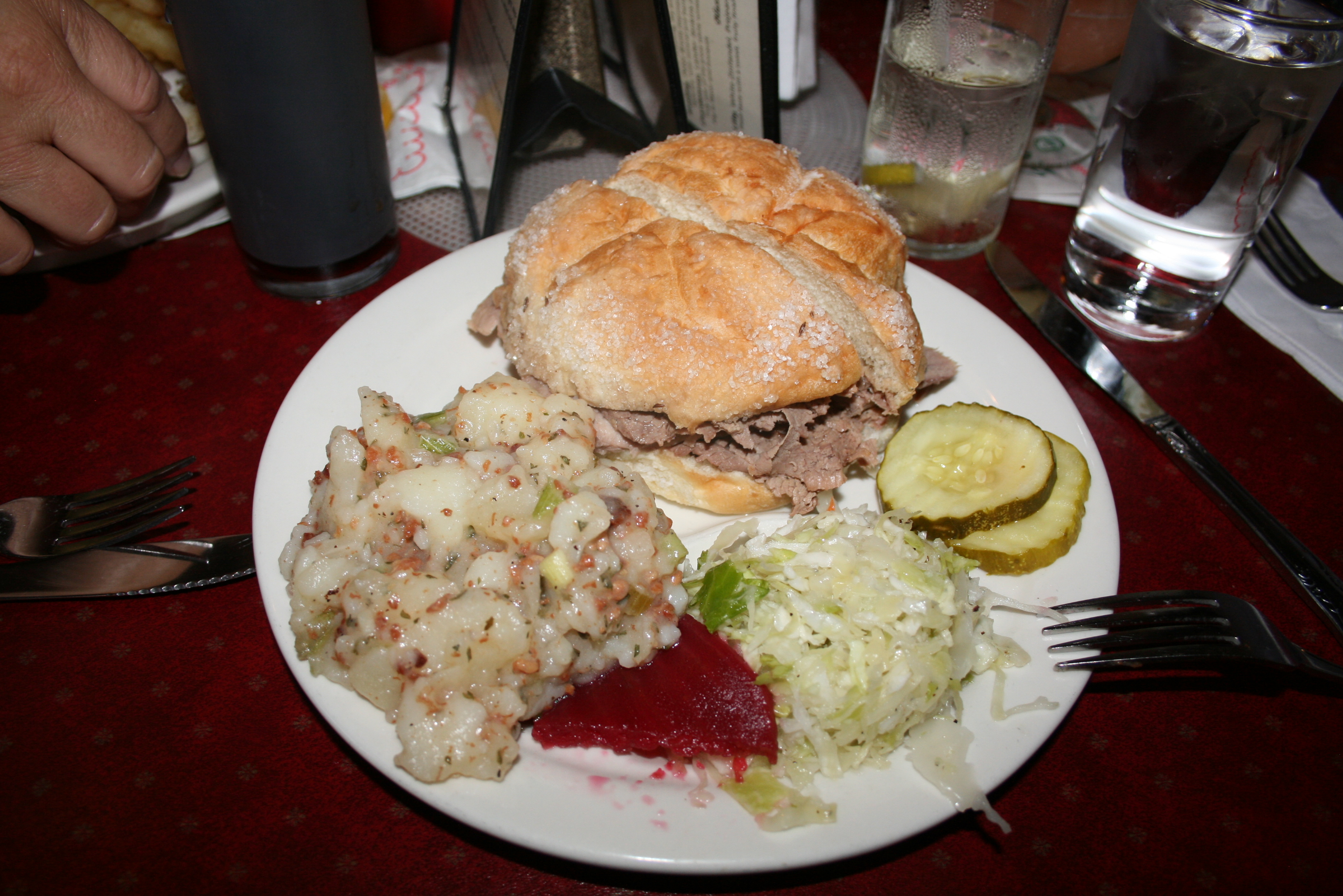 Sorry folks, had to use the flash for mine. Andrew’s dad and I opted for the german potato salad instead of fries and I didn’t regret it. Look at all the salt on the bun! Traditionally, you’re supposed to put horseradish on your sandwich. Horseradish jars sit on Buffalo dining establishment tables just like ketchup and mustard do everywhere else. I love horseradish, but man does it have a kick sometimes!