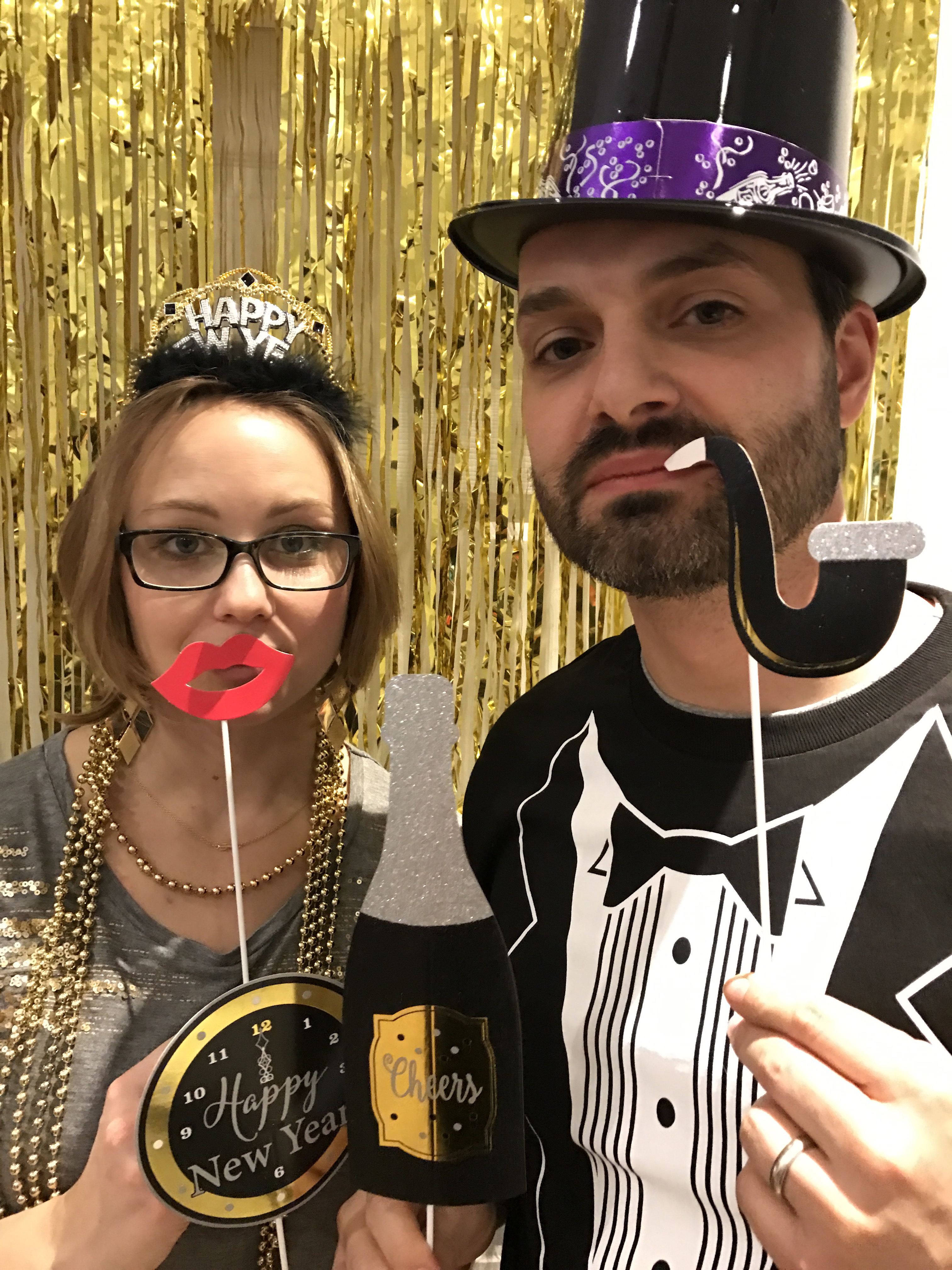 She and I planned a comfy-yet-stylish evening, complete with gold slippers, sequin tops and a well-equipped selfie station with props. We rented a small condo for the night, brought in all our food, ordered pizza and watched movies until the ball dropped (which we missed by about a minute).