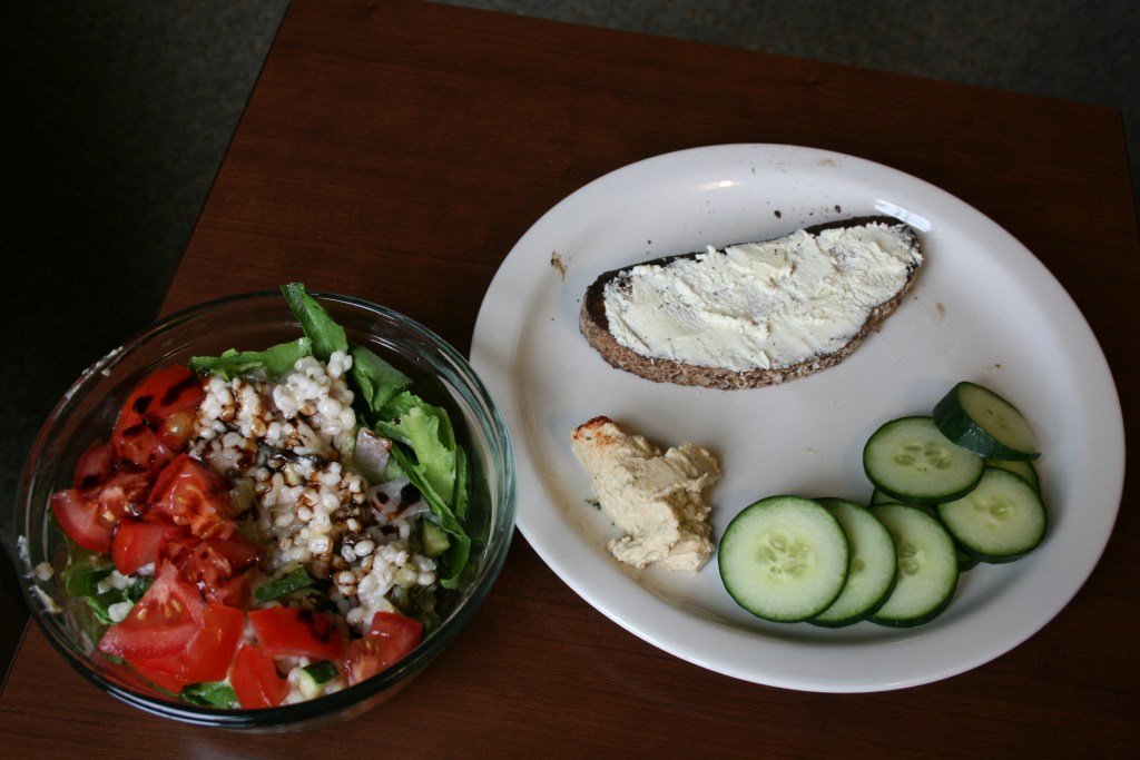 I served it with the toasted rye and flaxseed bread I got Saturday at the Co-op spread with the goat cheese from the farmers’ market, along with hummus and cucumbers.