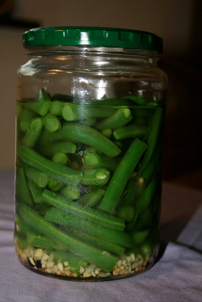 So, I bought a half-pound of green beans (for 50 cents!) and blanched and shocked them before packing them into the jar: