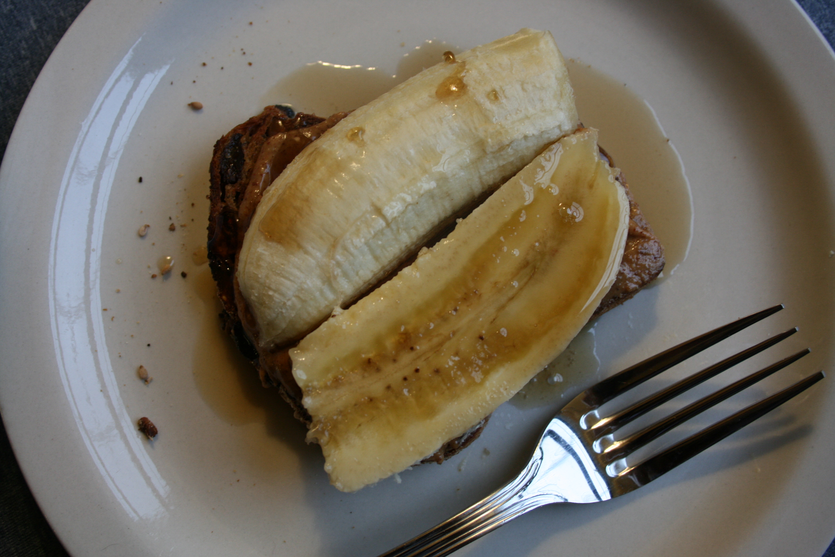 BIG BREAKFAST! Plain yogurt flavored with 1/2 banana, mashed, and 1/2 tbsp Trader Joe’s Mango Butter, blueberries and granola, AND Great Harvest whole-grain cinnamon raisin bread with 1 tbsp Justin’s Maple Almond Butter, the other half of the banana and a tablespoon of maple syrup. I was craving maple this morning.