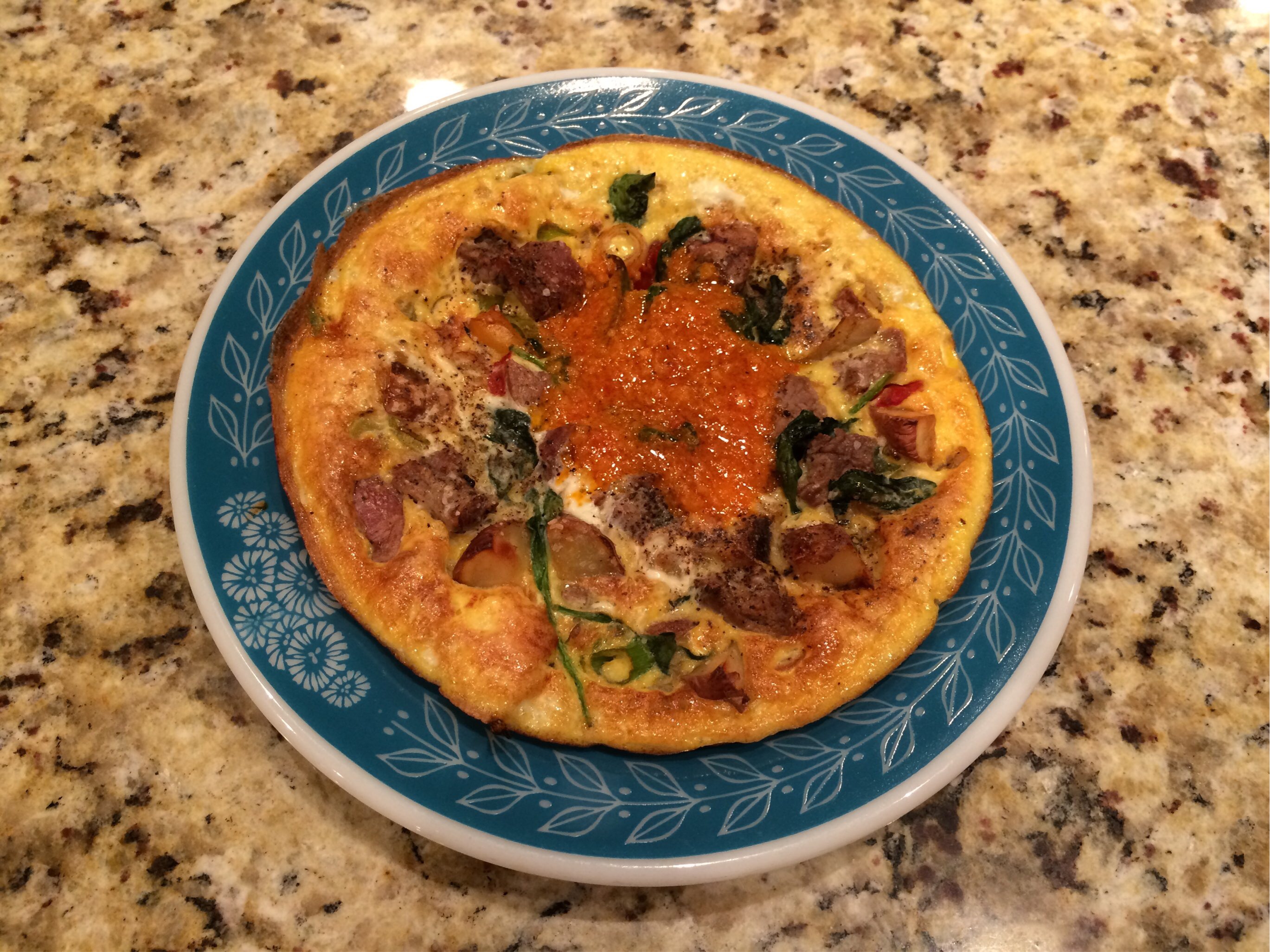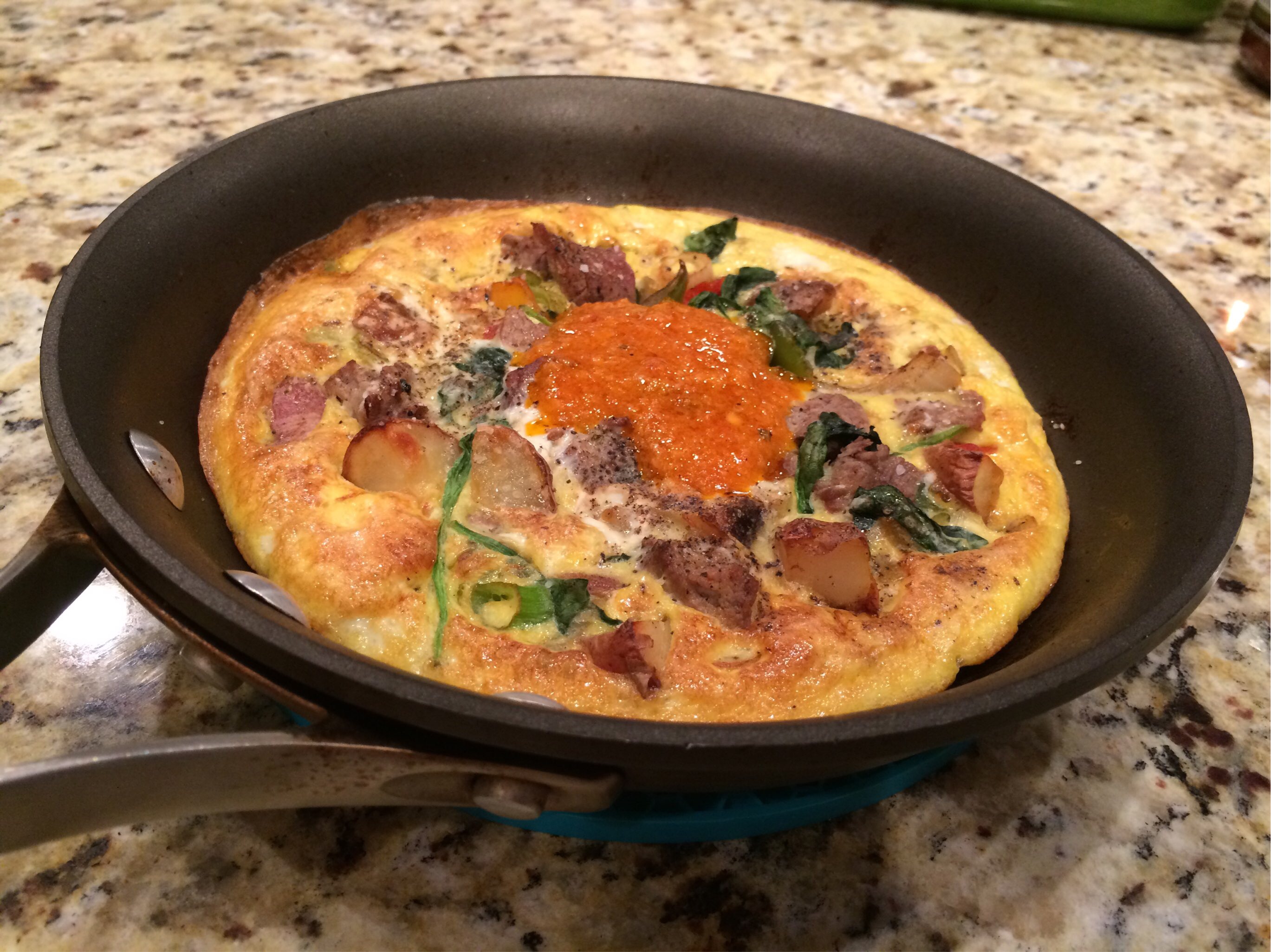 Pre-heat oven broiler. Heat a large non-stick skillet or cast-iron skillet over medium heat. Add chopped peppers and onions, sauté until soft. Add cut-up potatoes and spinach,sauté until greens are wilted. Add cooked meat to skillet, and cook just until heated through. Turn heat to medium-low and pour eggs into skillet but do not stir. Cook until edges begin to solidify; when the middle of the omelet is still runny, place skillet under broiler for 3-5 minutes. Slide omelet out of pan and onto a plate, cut into four wedges and top with Mojo Picon Sauce.