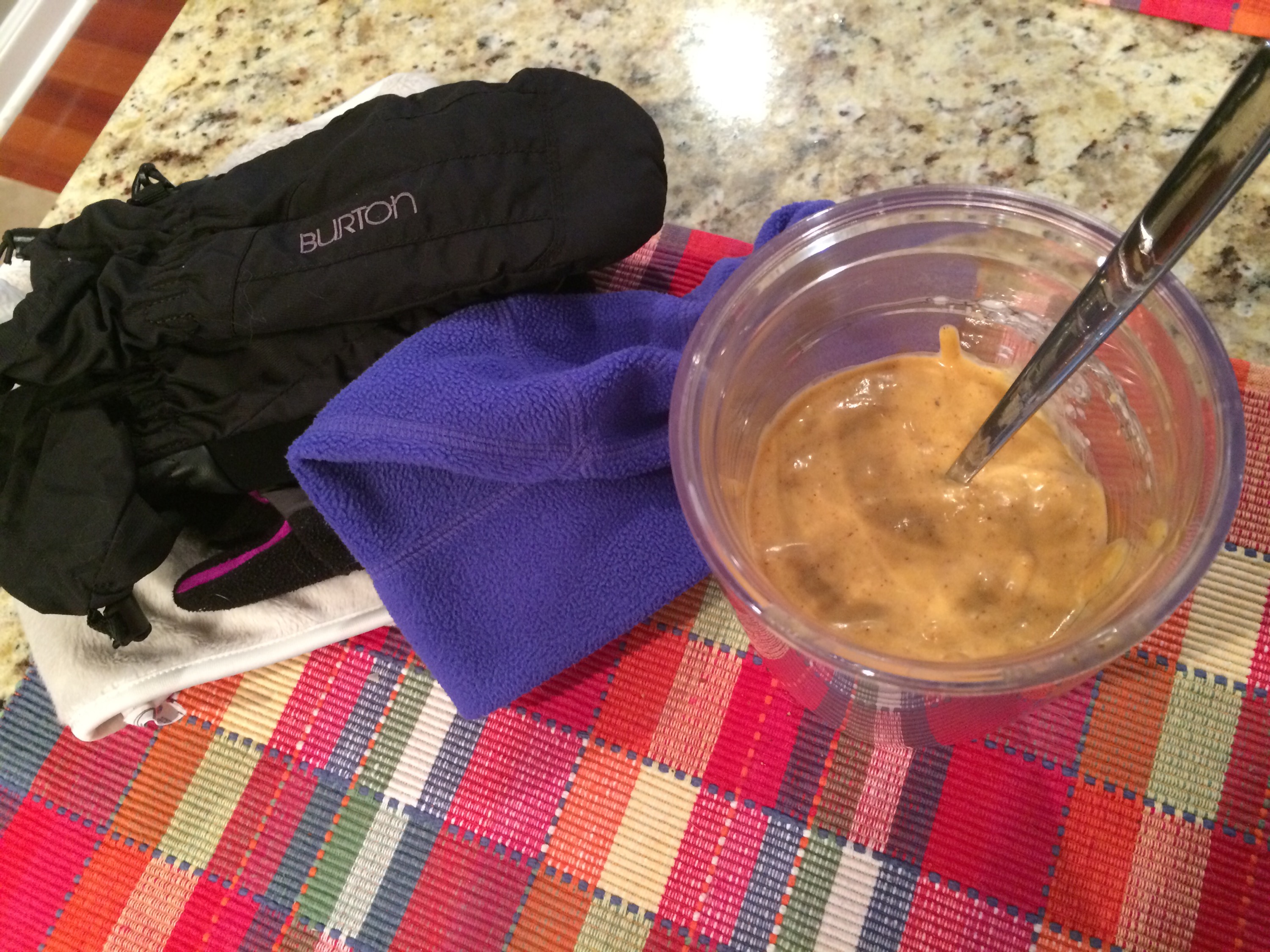 Before our snowshoe trek, I made myself a Paleo pumpkin gingerbread smoothie, with a frozen banana, pumpkin, almond milk, molasses, almond butter, chia seeds, and vanilla protein powder. In the future, I think I would omit the almond butter and banana as I don’t think it needs either–they’re just extra calories. If I used plain protein powder, I might keep the banana for sweetness.