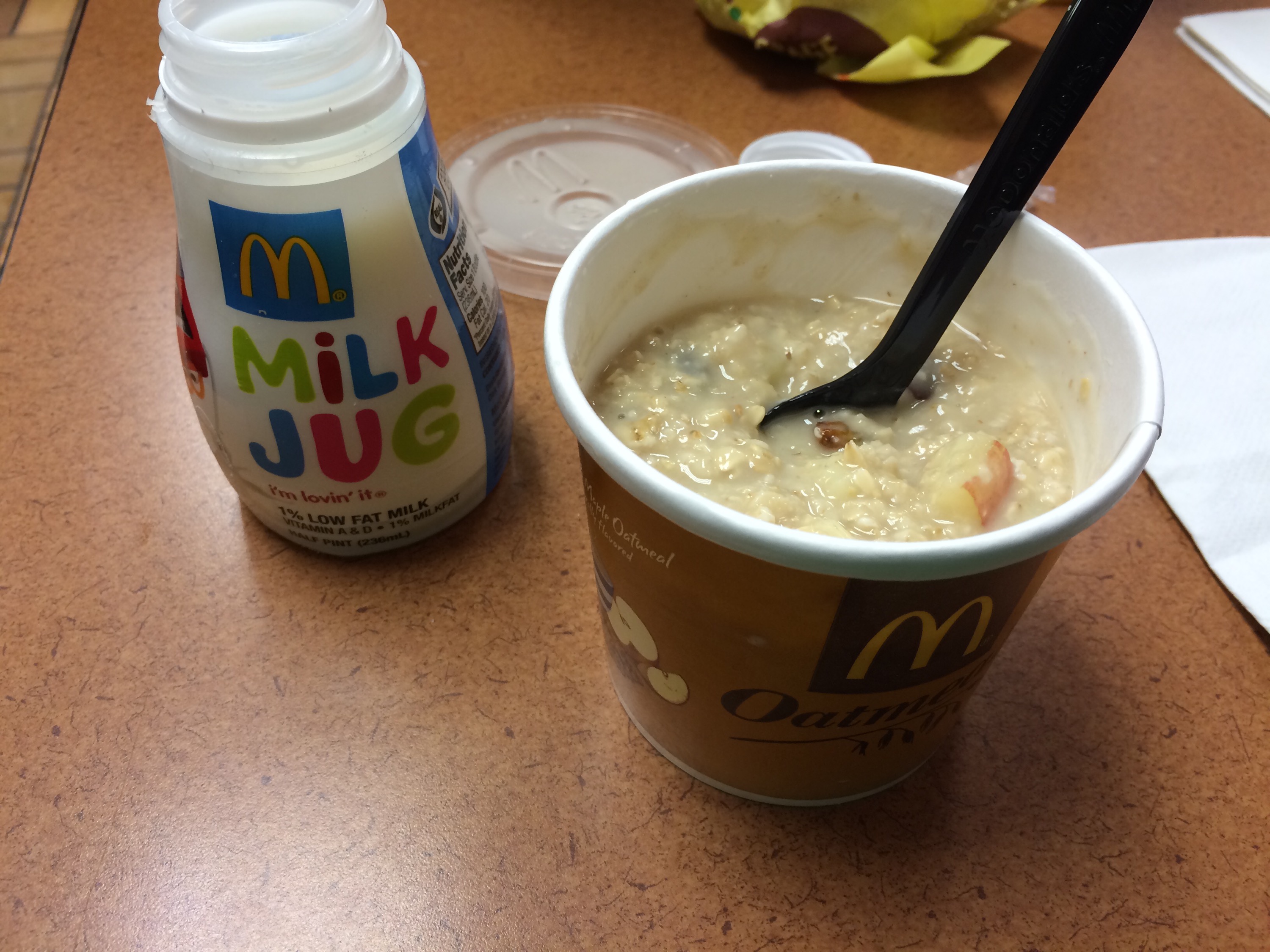 We met Marv and Abigail at McDonalds (of course) on their way out of town Sunday morning. I wasn’t in the mood for anything meaty or eggy, so I went with the oatmeal and a milk. Not Paleo, but arguably the ‘healthiest’ choice at said establishment.