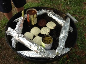 Dinner: corn, beans x 2 and burgers (note Andrew’s cheese-less patty). Sahlen’s hot dogs and brats were next, as well as some surprisingly good Wegmans pre-made potato salad. I’m not usually into pre-made “tub” salads, but this one wasn’t bad at all. Actually kinda good. Must be the camping talking.
