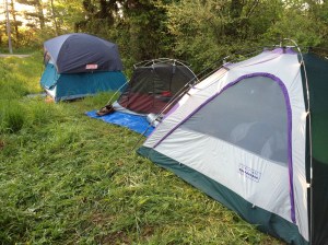 We set our tents up in row on the makeshift driveway. Thank goodness for air mattresses–I don’t care that it’s not hard-core camping; I value my sleep, AND my back!