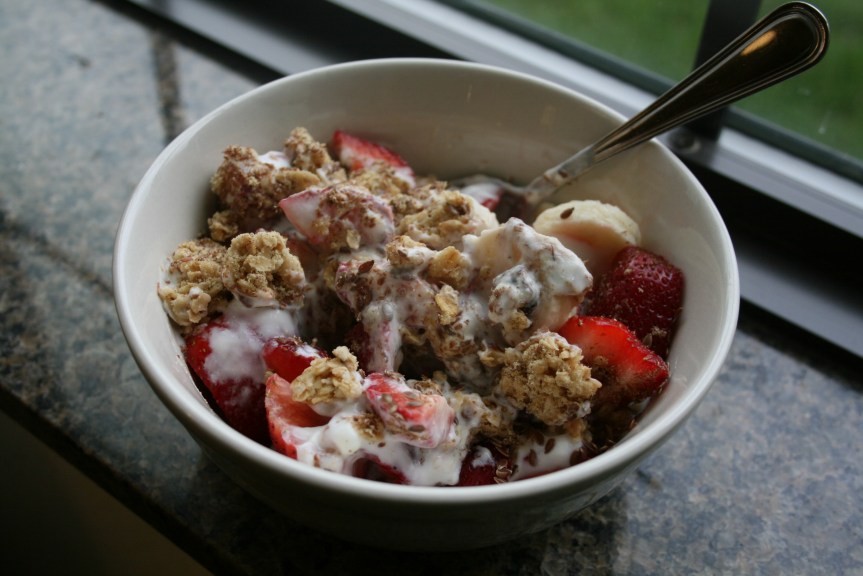 One banana, cut-up strawberries, 1/2 C plain yogurt, 1/4 Wegmans granola with raisins, flax seeds and flaxseed meal. YUM! Today will be filled with lots of water and nutritious foods to make up for yesterday’s steak sandwich and mindless munching. Overall, I think I did very well for someone watching what they’re eating while being surrounded by chips (I took it easy), beer (I refrained, mostly because I just wasn’t interested) and burgers (I ate what I packed–leftover quinoa and an orange).