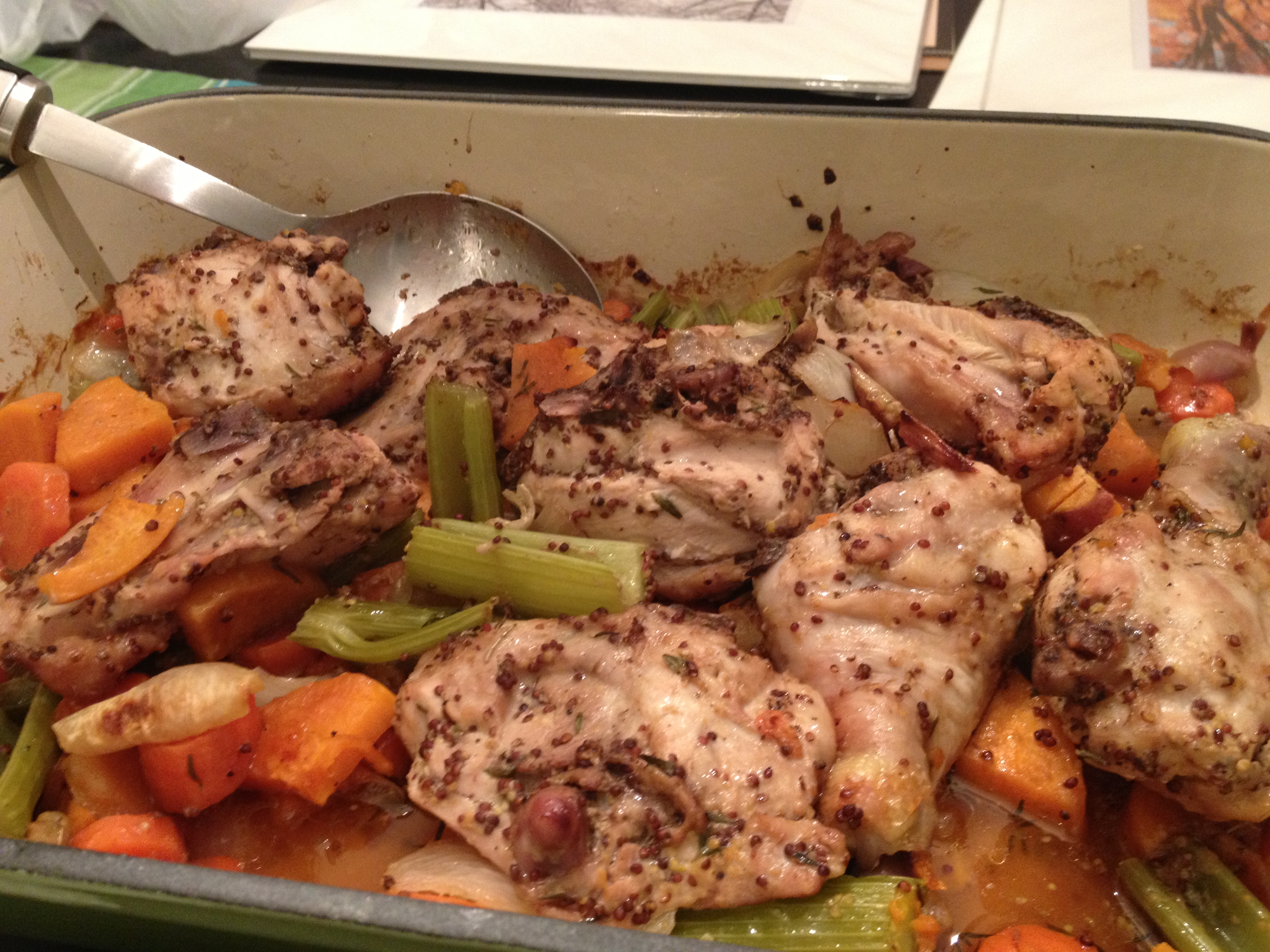 Mustard-roasted Chicken with Vegetables: an old-school, back-pocket classic. This is one of three chicken recipes I cut from a Real Simple magazine forever ago that I make over and over again. The other two are: Barbecue Apricot Chicken and Chicken Paprikash. You can’t go wrong with any of them.