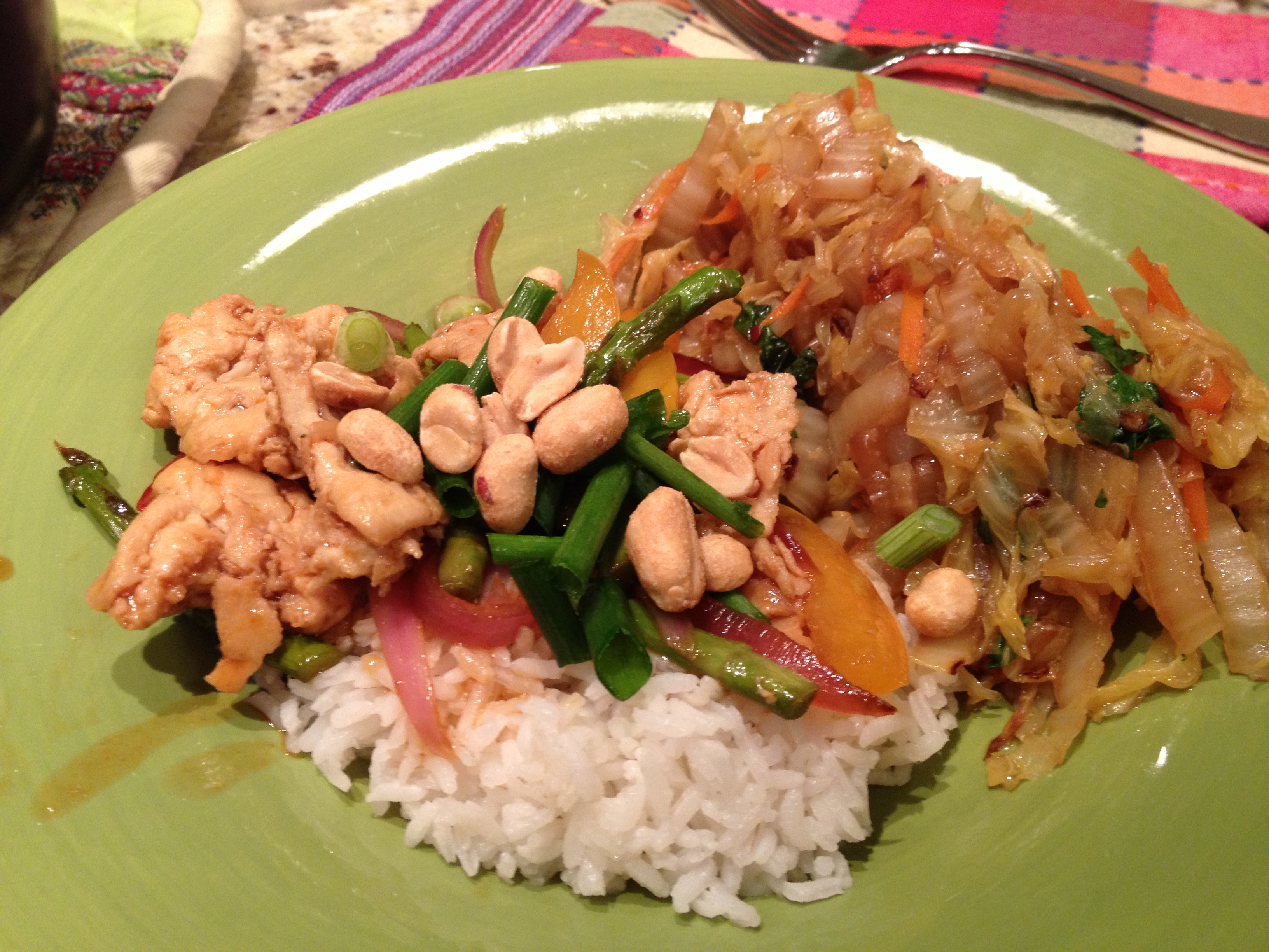 Cooking Light’s Sweet-Spicy Chicken and Vegetable Stir-Fry, served with Spicy Cabbage Stir-Fry. The chicken stir-fry was pretty good, although I totally overcooked the cabbage.