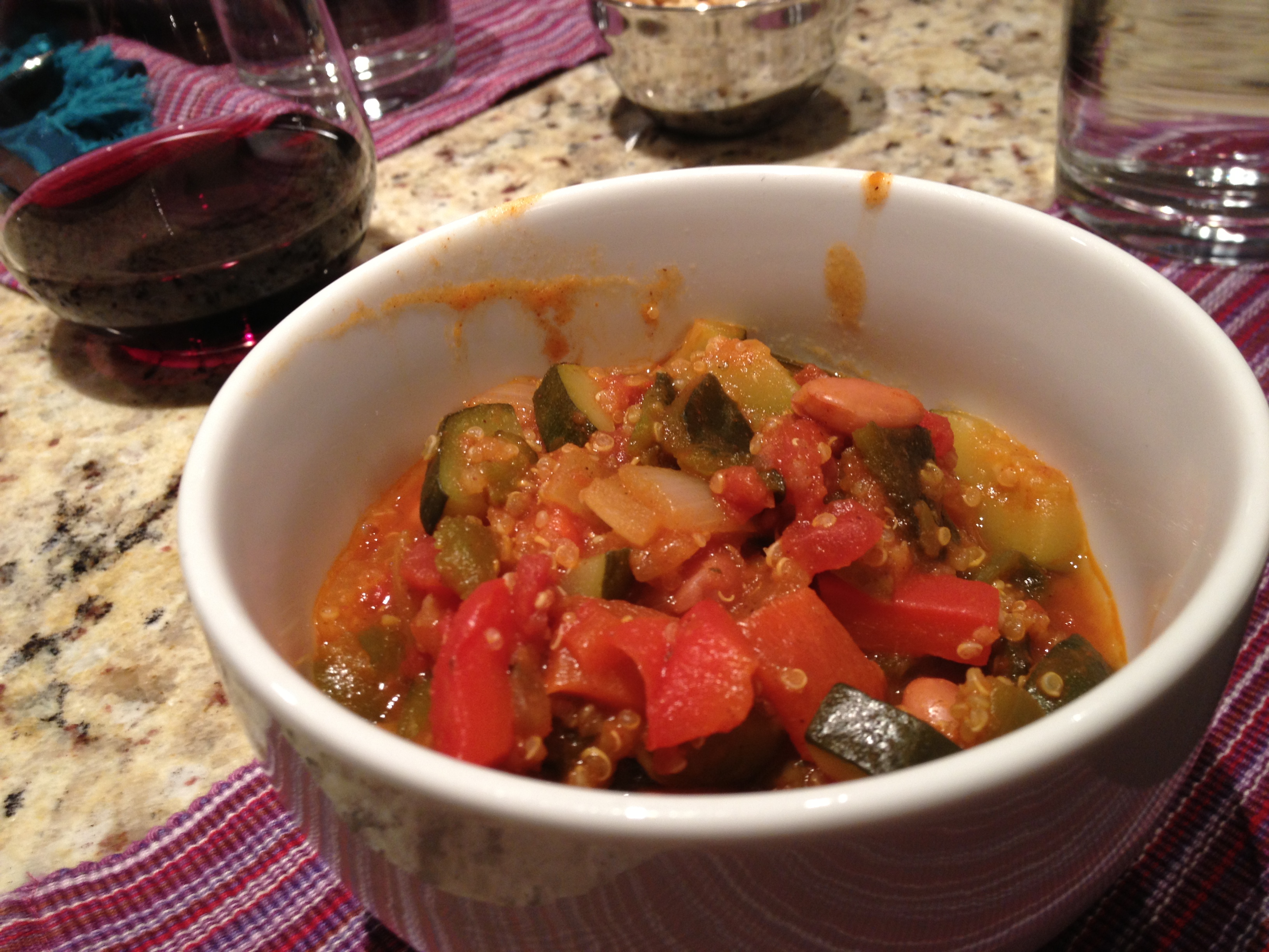 A couple nights ago I made CL’s Quinoa and Roasted Pepper Chili, and can you believe Andrew had TWO BOWLS?! It featured pinto beans (which I find to be much milder than kidney beans for chili), zucchini and roasted bell and poblano peppers. The flavor was traditional chili, but more vegetable-y. Quinoa is a grain that is high in protein, so it’s an excellent option for meatless dishes.