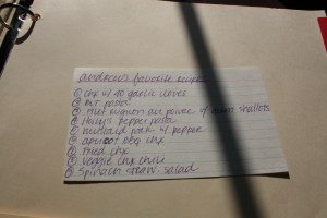 Look what I found! A 3×5 card on which I wrote a list of Andrew’s “favorites” at the time. Ina’s Chicken with 40 Garlic Cloves. BLT pasta (which I don’t make any more because I think it’s gross.) Mustard pork with pepper. Veggie chicken chili.