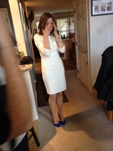 Betsy chose a simple, yet elegant (so Betsy) white fall dress from White House Black Market, and a pair of bright blue (‘something blue’) heels. The rest of us (not planned) ended up being in dresses that coordinated so well–teals, blues and black and white. A couple family members were in solid purple and red dresses, which really rounded out to be a beautiful wedding photo!