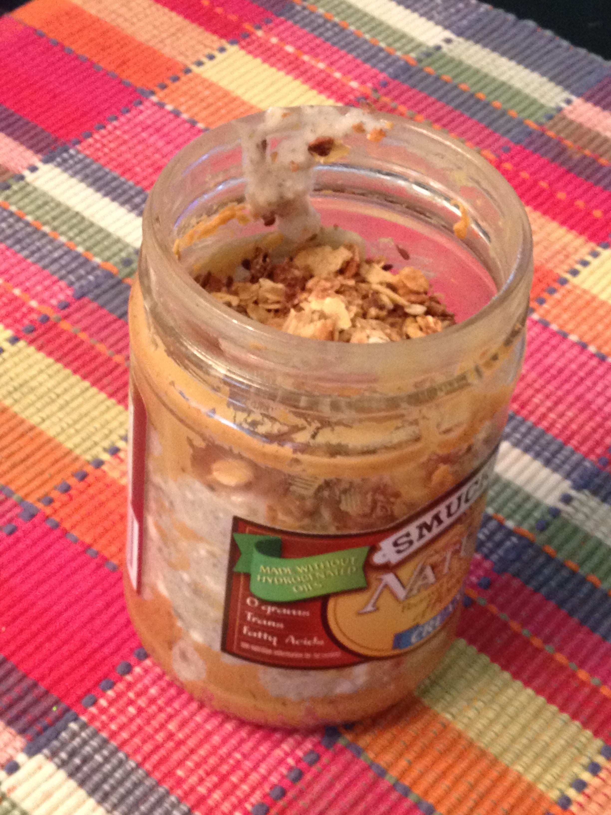 -I made oats in the Smucker’s jar (left) yesterday for lunch: oats, flaxseed meal, chia seeds, flax seeds, a splash of strawberry kefir, dehydrated strawberries, cottage cheese and granola on top. (Thanks for the granola, Susy!) Of course, all that with a little peanut butter swirled in. This baby filled me up for hours! Yay for having another one (Crunchy Barney Butter) in the fridge.