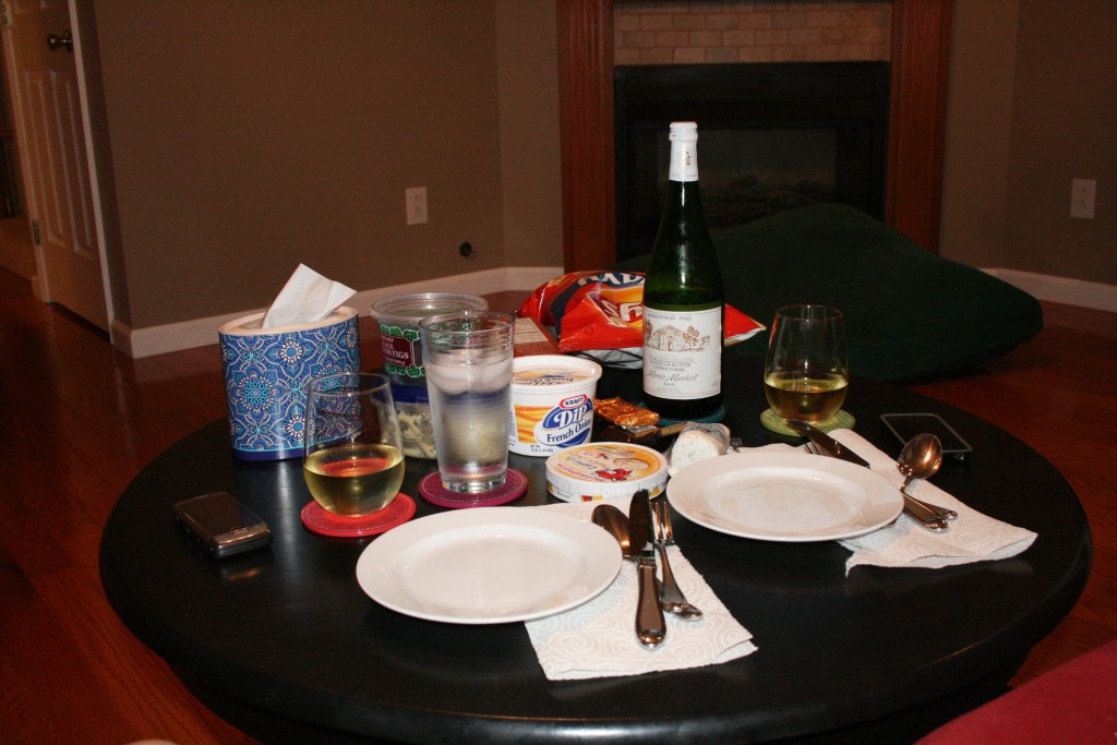 We enjoyed wine (Muscato), hummus, figs, orange-flavored dark chocolate, goat cheese and crackers. And wavy Lays and french onion dip. We’re high class like that. Seriously though, it must have been a long time since I’ve enjoyed a good chip and dip. They weren’t kidding when they said you can’t have just one!